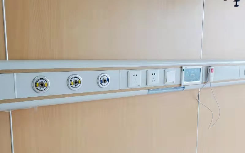 病房設備帶采用和裝飾墻板配色相近的杉木紋條和白色,每個床位安裝一個氧氣終端、兩個吸引終端、兩個電源插座、一個床頭燈和開關(guān)、一個7寸液晶顯示信息化呼叫器分機。