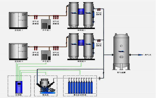 醫(yī)院中心壓縮空氣系統(tǒng)機組一般采用螺旋桿空壓機、冷干機、過濾器、儲氣罐等設(shè)備組成,通過管道連接至手術(shù)室、ICU、搶救室以及普通病房。