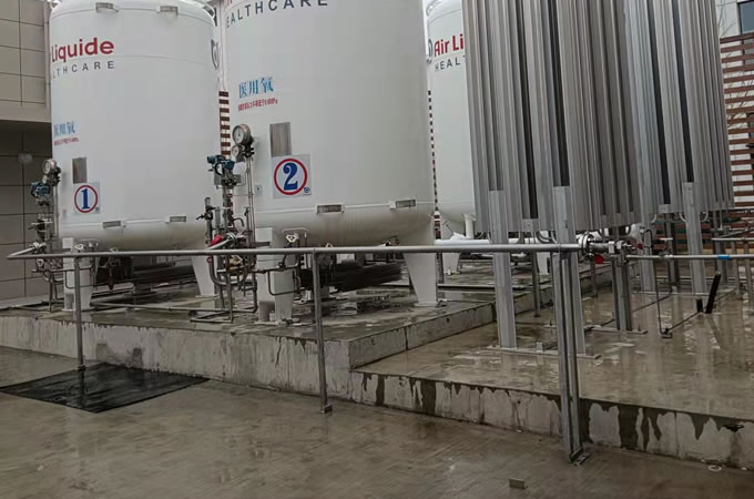 醫(yī)用液態(tài)氧儲槽,常用的單個(gè)容量主要有5m3的儲罐,一個(gè)或者多個(gè)組成使用,液態(tài)氧的形態(tài)類似水,溫度為-184°左右儲存,儲存壓力一般為0.7-1.5MPa區(qū)間,通過汽化器由液態(tài)轉(zhuǎn)換成氣態(tài)使用。