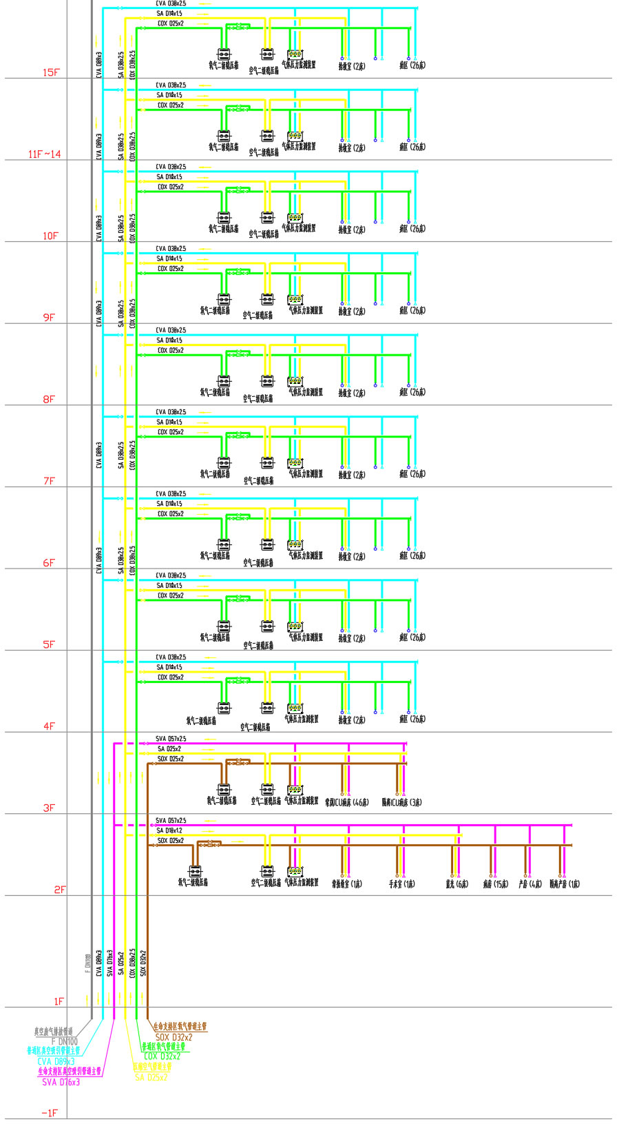 本項目為北京某三家醫(yī)院3#住院樓項目的醫(yī)用氣體設(shè)計。包括普通區(qū)氧氣管道系統(tǒng)、生命支持區(qū)氧氣管道系統(tǒng)、普通區(qū)真空吸引管道系統(tǒng)、生命支持區(qū)真空吸引系統(tǒng)、醫(yī)療壓縮空氣管道系統(tǒng)系統(tǒng)設(shè)計。普通區(qū)氧氣管路由院區(qū)液氧站提供、生命支持區(qū)氧氣由院區(qū)氧氣匯流排提供;真空吸引系統(tǒng)由院區(qū)真空匯提供;醫(yī)療壓縮空氣系統(tǒng)由院區(qū)制氧站提供。