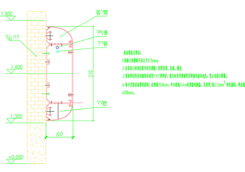 4.每個安裝設(shè)備帶的房間,在距墻150mm,中心距地1.45m處預(yù)留電源盒,且接進3組2.5mm2的電源線,伸出墻400mm。
